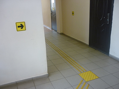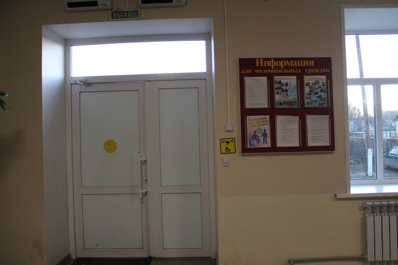 При входе в учреждение на доступной высоте расположены тактильные пиктограммы, кнопка вызова специалиста и приемник сигнала к ней. Входные и кабинетные двери маркированы яркими наклейками в виде кругов желтого цвета. На стенах находятся стенд с информацией для маломобильных граждан и тактильные указатели. В пол вмонтированы тактильные плитки и тактильные ленты, указывающие дорогу до кабинета специалистов отделения социально-консультативной помощи. На двери находится табличка с точечно-рельефным шрифтом (шрифтом Брайля) для удобства и комфорта слабовидящих и незрячих людей.